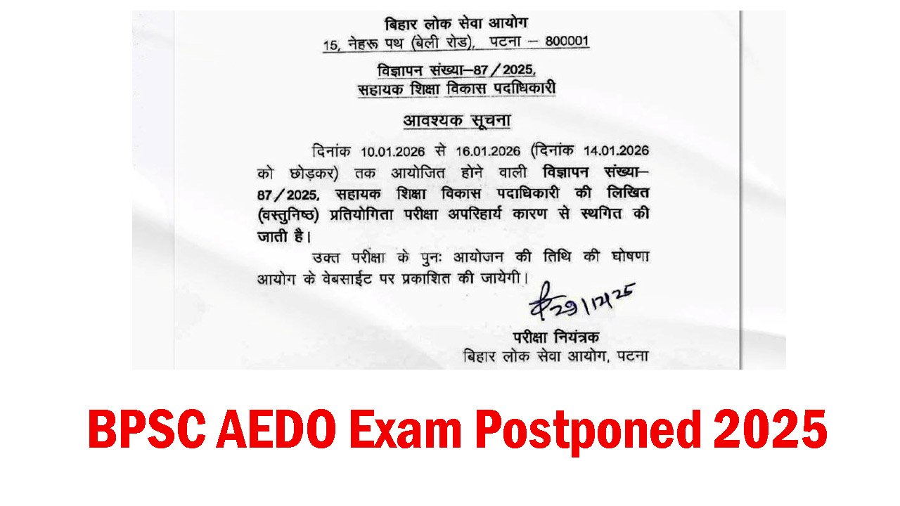 | Short Info | The Bihar Public Service Commission (BPSC) has postponed the examination date for the Assistant Education Development Officer (AEDO) recruitment 2025, as announced in advertisement number 87/2025. The new examination date will be announced very soon on the commission’s official website. The Bihar Assistant Education Development Officer (AEDO) examination, which was scheduled for January, has been cancelled. An official notification regarding this was issued on December 29, 2025. The link to the notification can be found below. |