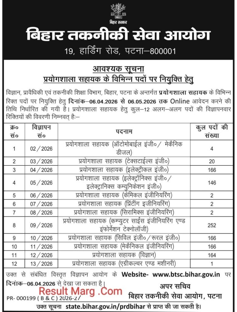 Short Information – The online application process for recruitment to various vacant posts of Laboratory Assistant, conducted by the Bihar Technical Service Commission (BTSC), will run from April 6 to May 6, 2026. Details regarding all the posts are provided below on this page, and you may download the official notification to review it.