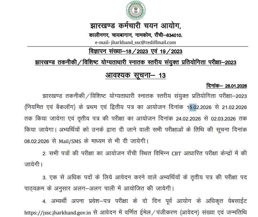 The wait is over for candidates who were eagerly awaiting the exam date for the Jharkhand Technical CGL Recruitment 2023. The exam will be conducted in the 15.02.2026 to 02.03.2026, and this information has been announced on the official website. If you want detailed information about the Jharkhand CGL recruitment exam, please read this article till the end. The exam details have been provided on the official website of the Jharkhand Staff Selection Commission (JSSC).