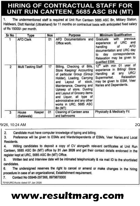 Unit Run Canteen 5685 ASC BN (MT) आवेदन 31 जनवरी 2026 तक या उससे पहले जमा किया जाना अनिवार्य है। लिफाफे पर स्पष्ट लिखें: – |