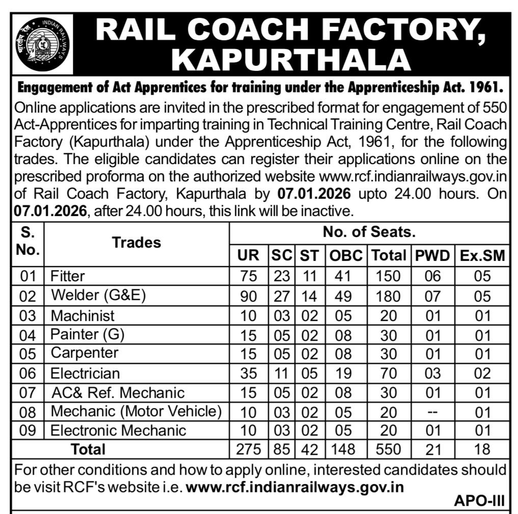Rail Coach Factory Kapurthala Recruitment 2025 Notification for 550 Posts