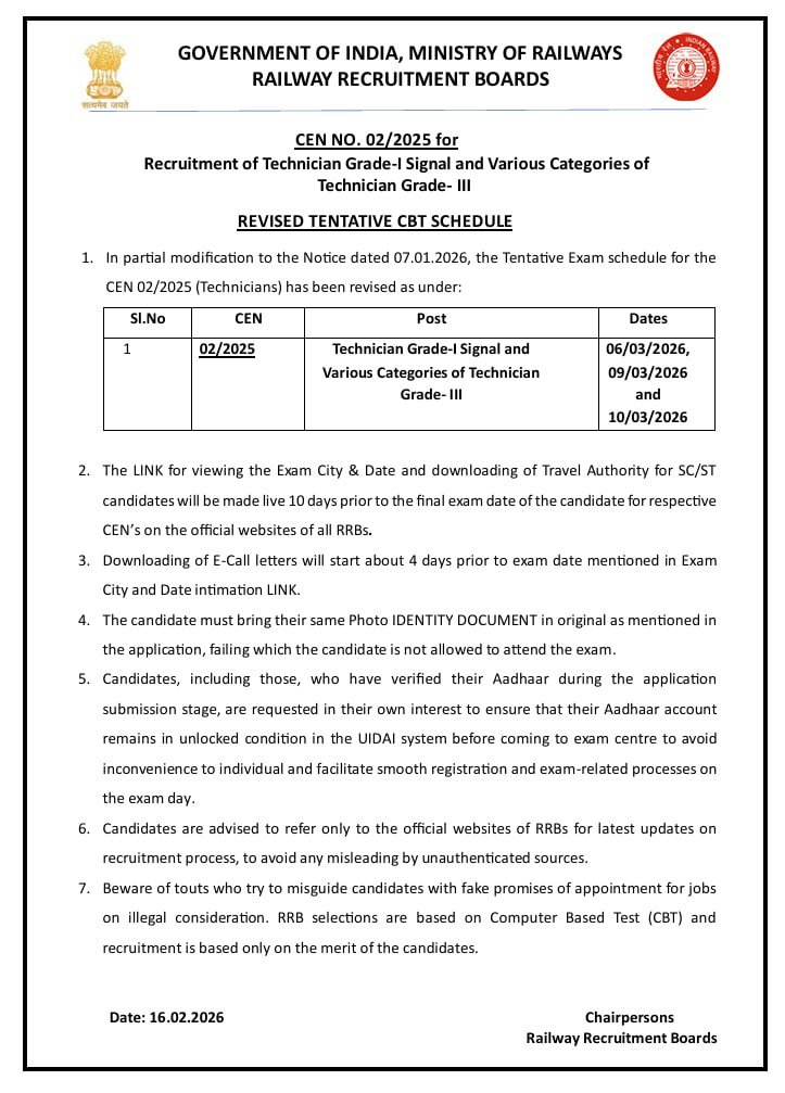 RRB Technician Revised Exam Date 2026 OUT Railway CEN No 02/2025 Exam Schedule Notice
